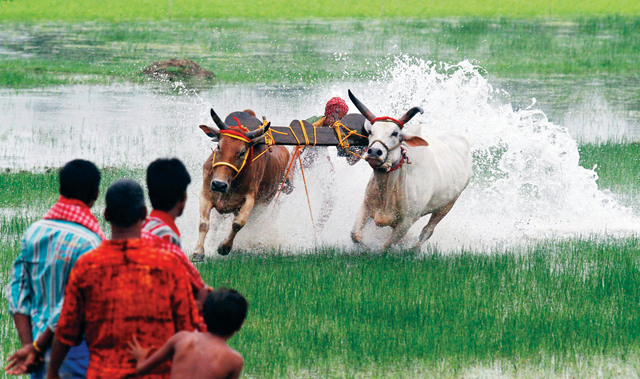 سباق رويترزقرويون يراقبون سباق الثيران مع أحد المزراعين في مدين كاننغ الواقعة في شرق الهند، أول من أمس. ويشارك في هذا السباق نحو 53 مزارعاً مع 128 ثوراً من أنحاء المنطقة، ويستمر السباق يومين. وسيعوض الفائزون بهدايا على شكل دراجات هوائية وأجهزة راديو وغيرها.
