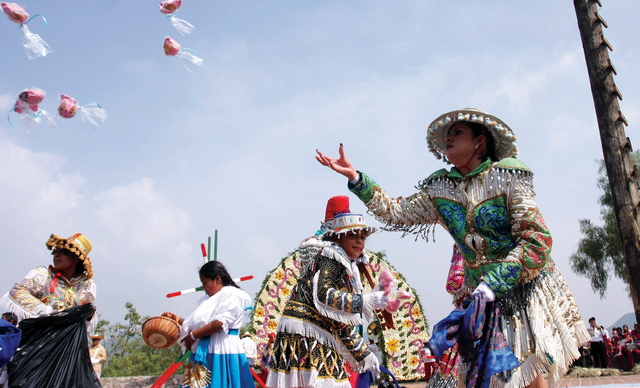 مجموعة من الراقصين التقليديين يشاركون في مهرجان للرقص الشعبي يقام سنوياً في بلدية اتلكسيكو في المكسيك أول من أمس. وينحدر الراقصون من مختلف الأثنيات والأعراق والجنسيات المتعايشة في هذا البلد حيث يجمعهم الرقص والموسيقى والغناء مرة في العام، فيتحول هذا اليوم إلى ما يشبه العيد بكل أفراحه ومباهجه.