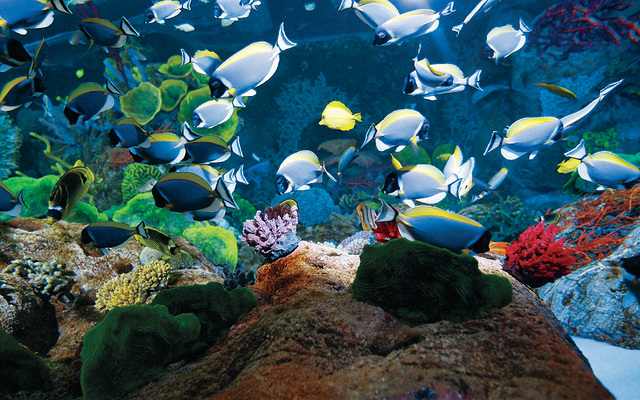 وأضاف: قمنا بتزيين الأحواض الثلاثة من الداخل، بشعب مرجانية صناعية، تشبه بأشكالها وألوانها الجذابة الشعب المرجانية الطبيعية الموجودة في أعماق البحار والمحيطات، لأن الأدوية الخاصة بالأسماك تؤثر سلباً على الشعب المرجانية الطبيعية وقد تنهي حياتها.