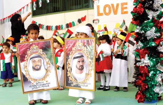 للأطفال مساهمتهم في اليوم الوطني، يحتفون به على طريقتهم المفعمة بالبراءة والطهارة، وها هم أطفال مدرسة دبي الوطنية يحتفلون باليوم الوطني الواحد والأربعين للدولة، ويرفعون صورة صاحب السمو الشيخ خليفة بن زايد آل نهيان رئيس الدولة، حفظه الله، وأخرى لصاحب السمو الشيخ محمد بن راشد آل مكتوم نائب رئيس الدولة رئيس مجلس الوزراء حاكم دبي، رعاه الله.
