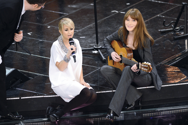 مهرجان الأغنية العاطفية غيتيالمذيعة الإيطالية الشهيرة لوسيانا ليتيزيتو، والمغنية كارلا بروني، زوجة الرئيس الفرنسي السابق نيكولا ساركوزي، خلال فاعليات الليلة الثانية من مهرجان الأغنية الإيطالية في سان ريمو في دورته الـ63، أول من أمس، وهو أكبر مهرجان للأغنية العاطفية في أوروبا.