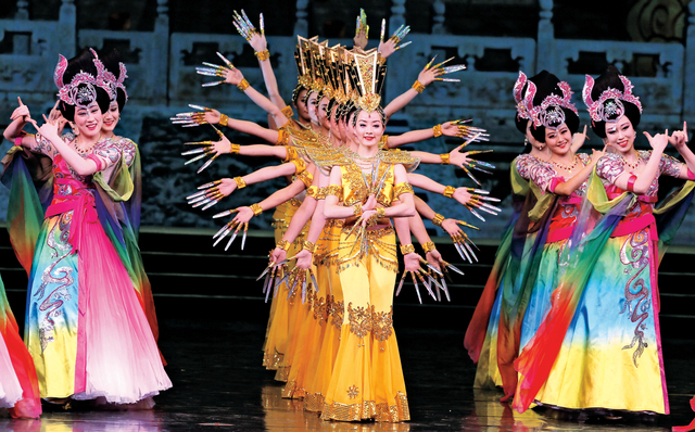 راقصات صينيات بالزي التقليدي والألوان المتنوعة والمبهجة يؤدون لوحة فنية معبرة تعتمد على حركة الأيدي كمحور أساسي في هذه الرقصة التقليدية وذلك خلال حفل افتتاح (مهرجان السياحة الصينية في روسيا) الذي يقام بحضور الرئيس الصيني شي جينبينغ ونظيره الروسي فلاديمير بوتين في قصر الكرملين في العاصمة موسكو