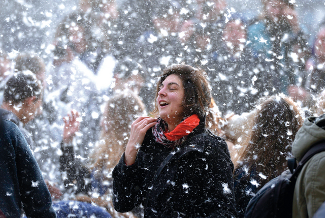 المجر.. حرب الوسائد أ بموجة من الفرح العارم، ارتسمت على وجه الشابة في الصورة،خلال مشاركتها مجموعة من أقرانها، القتال بالوسائد، أول من أمس، في العاصمة المجرية بودابست، أثناء فعاليات الاحتفال بالمهرجان السنوي في البلاد: «اليوم الوطني للقتال بالوسائد». .