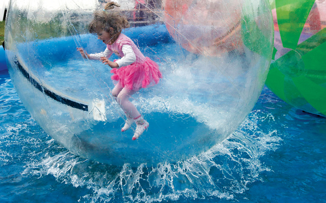 براغ.. بالون مائي رويترزثنيُ الركبتين، ويدان تتلمسان رذاذ البهجة الممزوج بالحذر في بالون بلاستيكي طفى على الماء، كان قد ابتلع طفلة نظير مكافأتها باللعب، وذلك في حديقة ملاهٍ في إحدى ضواحي مدينة براغ، أول من أمس.