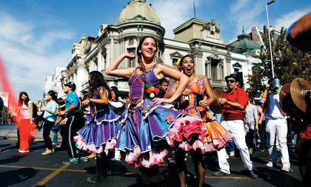 ناشطات وناشطون يرتدون أزياء تقليدية وراقصة يشاركون في موكب إحياء ذكرى يوم الأرض في وسط مدينة سانتياغو التي نظمت تحت عنوان "مسيرة لحماية المياه" وذلك في صرخة واضحة ضد العابثين بصحة الناس والمسهترين بأمورهم الصحية. وقد شارك في الاحتفالية طلاب وأعضاء من منظمات تهتم بشؤون البيئة .
