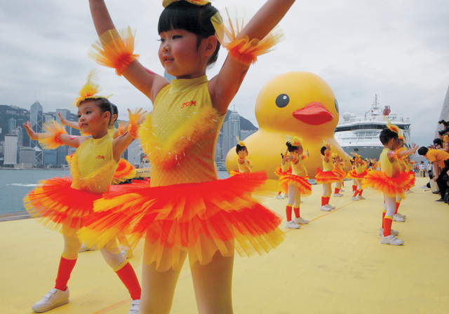 مجموعة من الأطفال بالزي التقليدي الموحد يؤدون لوحة راقصة أمس خلال مراسم الترحيب بمجسم "بطة المطاط" العملاقة في هونغ كونغ التي ابتكرها الفنان الهولندي فلورينتيجن هوفمان عام 2007. وتنقلت البطة المطاط التي يبلغ ارتفاعها 16.5 مترا (54 قدما) الى عدد من العواصم المدن، أوساكا وسيدني وساو باولو وأمستردام.