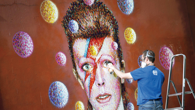 وفاء فنان " أ ف بالفنان الاسترالي جيمس كوشران المعروف بلقب جيمي سي يقوم بوضع لمساته النهائية على صورة ضخمة ثلاثية الابعاد للموسيقي البريطاني ديفيد بوين في منطقة بريكستون جنوب لندن. استلهم الفنان الاسترالي الصورة من غلاف البوم بوي لعام 1973 وكان بعنوان" علاء الدين