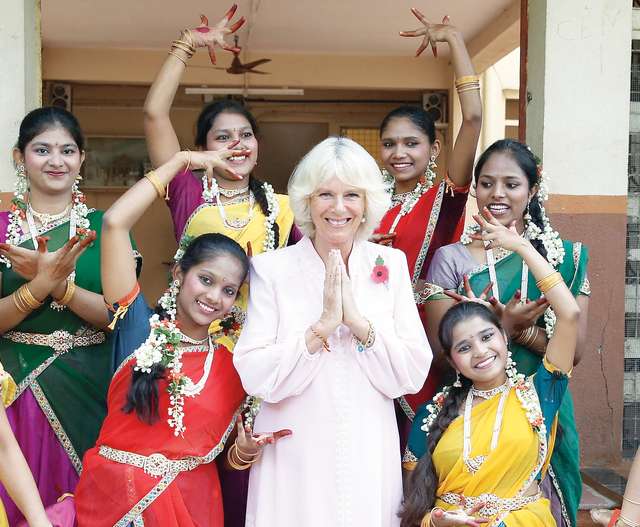 كاميلا دوقة كورنوول بالزي التقليدي الهندي تقوم ببعض خطوات الرقص وسط مجموعة من الفتيات الهندبات من (بيت الأمل) للأطفال في مدينة مومباي، خلال زيارة رسمية لها برفقة زوجها الامير تشارلز ولي عهد بريطانيا. وتعتبر هذه الزيارة التي قام بها الزوجان الملكيان للهند هي الأكثر شمولاً حتى الآن.