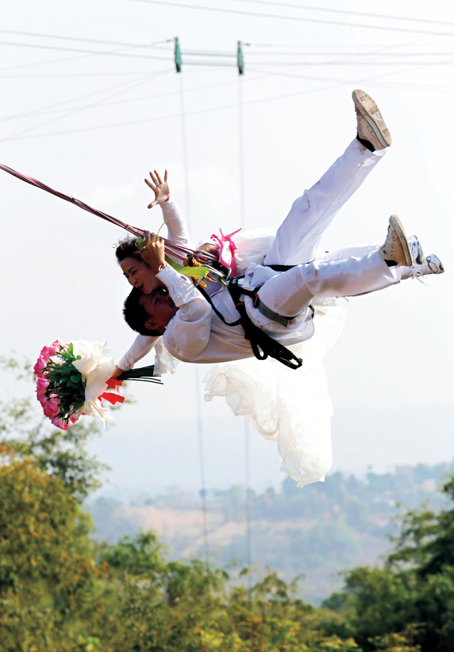 مغامرة عروسان من تايلاند يمسكان بيد بعضهما وهما يهربان من قراصنة مفترضين خلال مغامرة افتراضية أيضا، في مقاطعة براتشين، شارك في المغامرة الافتراضية ثلاثة أزواج وزوجات لإثبات حبهم لبعضهم البعض.
