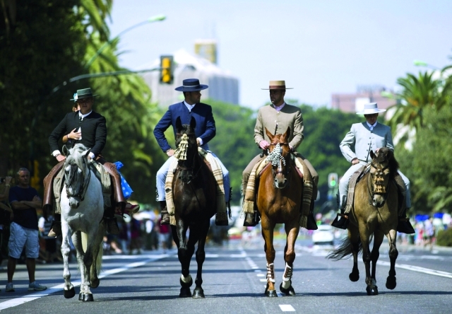 ملقة.. رحلة فرسان أيه بي اياربعة من الفرسان بالزي التقليدي في رحلة على خيولهم الى لا فيكتوريا في اطار مهرجان ملقة في الاندلس جنوبي اسبانيا. يشمل المهرجان الموسيقى والعروض الارضية و يشارك فيه راقصون و راقصات و مصارعو ثيران و تقام فيه سباقات عدو من 16 الى 23 اغسطس.