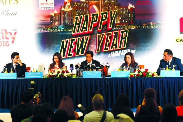 شاروخان فضل في بداية حديثه العودة بذاكرته إلى المؤتمر الصحافي الذي عقده في سبتمبر 2013، وتم فيه الاعلان عن بدء أعمال تصوير الفيلم، وقال: «مرة أخرى نعود إلى دبي لنحتفل فيها بالعرض الأول لفيلم "هابي نيو يير"، الذي قضينا في تصويره نحو 45 يوماً، وشارك فيه نحو 200 شخص، وجميل جداً أن نعود لنحتفل بفيلمنا في المكان الذي استضافنا وصورنا فيه، فأنا وفريق العمل لدينا الكثير من الذكريات الرائعة في هذا المكان، الذي فضلنا أن يحتضن الاطلاق العالمي للفيلم، كما احتضن ذكرياتنا».