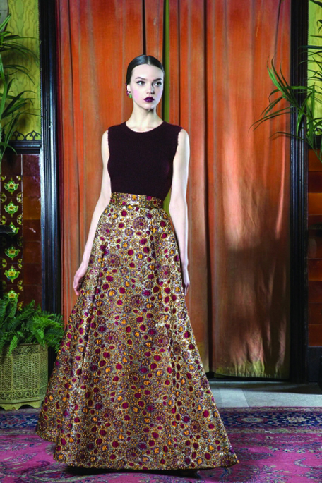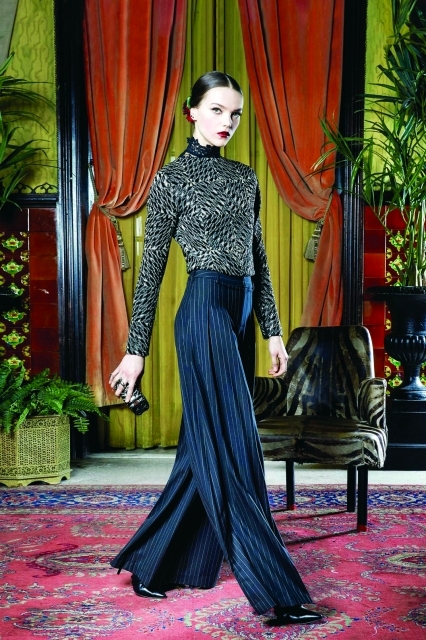 وبهذا الأقمشة والألوان وضعت «بندت» تصاميم لمعاطف وسراويل طويلة وضمنتها أنماط الجاكار الملكية. من أجل طلة فخمة نسقت سترة طويلة منمقة بالجاكار باللون الذهبي والأزرق مع سروال مطابق وبلوزة عالية عند العنق، فهذا النمط من البلوزات وخاصة الدانتيل منها هو طراز رئيسي لفصل الخريف.