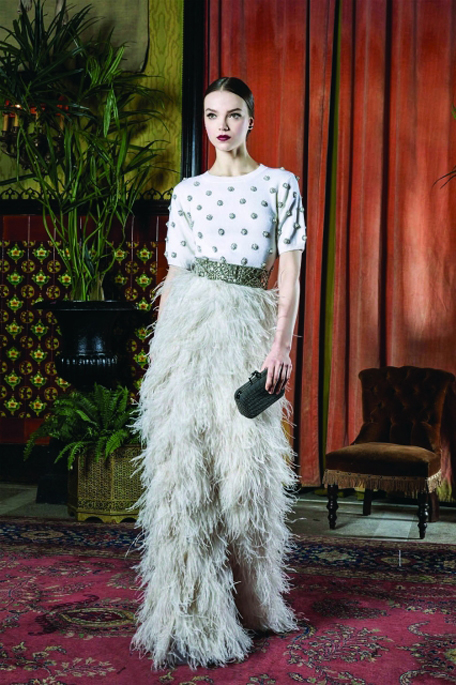واستخدمت أقمشة بطبعات جديدة، في فساتين طويلة وهدلة جاءت منمقة بالدانتيل، واستعادت استخدام أزهار «الجاكار» لتظهر على الألبسة المعاصرة وتصاميم غرافيية للألماس بانت على السراويل الواسعة الساق، أما الألوان فتبدو وكأنها لوحة لفصل الخريف غنية وتتضمن الأبيض، الأسود، والكراميل مما سمح لها بتسليط الضوء على الألوان الأكثر دفئاً مثل الأحمر الغامق الأزرق، والأخضر.