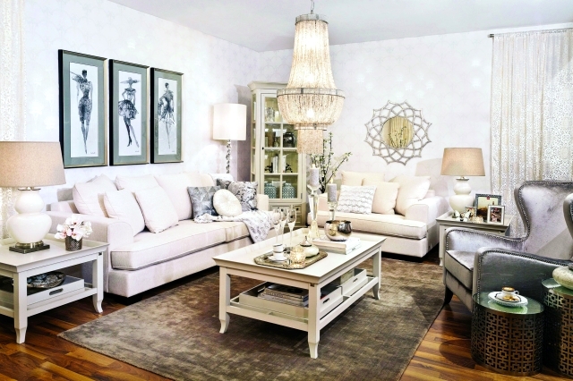 وأحياناً توزيع الفراء على الحائط، مما يمنح الإحساس بالدفء، أو يمكن استبداله بورق جدران بنقشة الزهور الرقيقة، التي تؤمن خلفية مناسبة لأقمشة ناعمة الملمس صنعت منها قطع الأثاث، التي دخلت فيها أحياناً القطع الخشبية البيضاء اللماعة، كما يمكن تزيين الطاولات بقطع من الزجاج الشفاف والسيراميك الأبيض الثلجي. بينما تضيف الثريات المصنوعة من الكريستال لمسات نهائية تمنح المكان نوعاً من الفخامة.