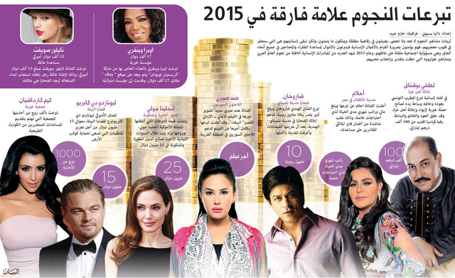 ثروات مشاهير النجوم لا تعد ولا تحصى، يعيشون في رفاهية مطلقة ويملكون ما يتمنون، ولكن تبقى إنسانيتهم هي التي ستحفر في قلوب معجبيهم، فهم يؤمنون بضرورة القيام بالأعمال الإنسانية فيتبرعون بالأموال لمساعدة الفقراء والمحتاجين في جميع أنحاء العالم، وهي مسؤولية اجتماعية ملقاة على عاتقهم، وعام 2015 شهد العديد من المبادرات الإنسانية اللافتة من نجوم العالم العربي ومشاهير هوليوود التي حظت بتقدير وإعجاب محبيهم.
