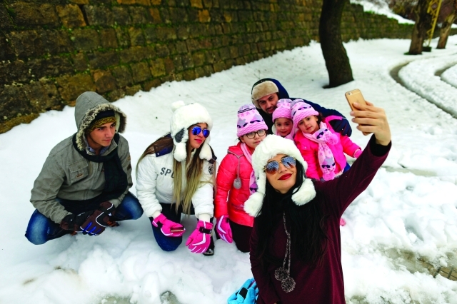 ثلج لبنان بالسيلفي عائلة لبنانية تلتقط سيلفي في شارع تغطيه الثلوج في مدينة صوفر في جبل لبنان أمس، حيث اجتاحت عاصفة ثلجية لبنان في اليوم الأول من العام الجديد، وقطعت الطرق الجبلية، وعزلت العديد من القرى