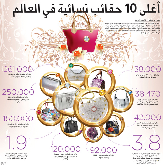 لا شك أن حقيبة اليد تعزز أناقة المظهر والإطلالة النهائية، ولكنها تحولت بفضل صناع الموضة حول العالم من مجرد إكسسوارات إلى تحف فنية تستوقف النظر وتأسر الألباب وتلبي رغبات عاشقات التميز، ممن يطمحن إلى اقتناء حقائب نوعية فريدة تعكس رقيهن وشغفهن بامتلاك حقائب محدودة الإصدار أو حقائب أخرى لا تتجاوز أعدادها حول العالم أصابع اليد، وإليكم أغلى 10 حقائب نسائية في العالم.