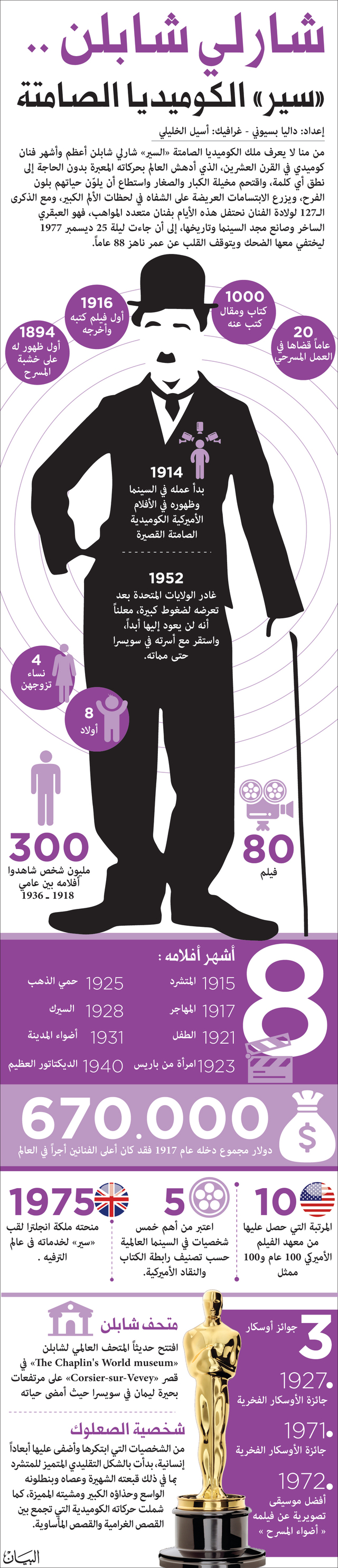 من منا لا يعرف ملك الكوميديا الصامتة شارلي شابلن أعظم وأشهر فنان كوميدي في القرن العشرين، الذي أدهش العالم بحركاته المعبرة بدون الحاجة إلى نطق أي كلمة، واقتحم مخيلة الكبار والصغار واستطاع أن يلوّن حياتهم بلون الفرح، ويزرع الابتسامات العريضة على الشفاه في لحظات الألم الكبير، ومع الذكرى الـ127 لولادة الفنان (1889 ـ 1977) نحتفل هذه الأيام بفنان عبقري متعدد المواهب، ممثلاً ومخرجاً ومؤلفاً ومنتجاً ومؤلفاً موسيقياً وناقداً، فهو العبقري الساخر، والشاعر على طريقته الخاصة، وصانع مجد السينما وتاريخها، ولكن في ليلة 25 ديسمبر 1977 اختفى الضحك وتوقف قلب شارلي شابلن عن عمر يناهز 88 عاماً، ليستريح الرجل الأسطورة ويترك فراغاً بعد أن لعب دوره المثير فوق مسرح الحياة، على أكمل وجه.