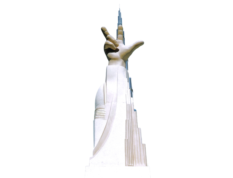 وصولاً لمجسم الذراع المرفوعة بعلامة النصر الثلاثية التي ابتكرها صاحب السمو الشيخ محمد بن راشد آل مكتوم، نائب رئيس الدولة، رئيس مجلس الوزراء، حاكم دبي، رعاه الله، ومجسم الإبل، ذلك النصب الذي أقيم أخيراً في المنطقة ذاتها، ويقع أمام برج خليفة، ويضم ثلاث منحوتات لإبل يبلغ وزنها 800 كيلوغرام، وترمز إلى الصلة الوطيدة بين المجتمع العربي والإبل.