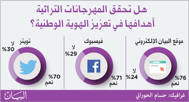 البيان طرحت هذا السؤال عبر منابرها المختلفة لتستطلع آراء متابعيها، فكانت النتائج متقاربة في مؤداها، التي أكدت في مضمونها أهمية المهرجانات الوطنية في رفد وتعزيز الهوية الوطنية.