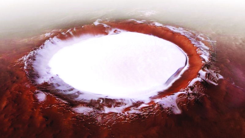 نشرت صحيفة «ذي صن» البريطانية، أمس، صوراً لفوهة جبل «كوروليف» العملاقة على سطح كوكب المريخ، وهي ممتلئة بطبقة كثيفة من الجليد يبلغ سمكها 1.2 ميل «نحو 1.9 كيلومتر».