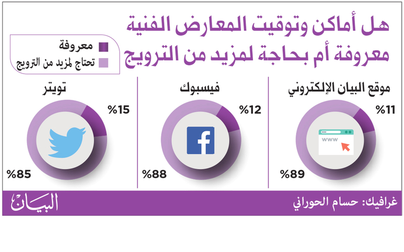 كشفت نتائج الاستطلاع الأسبوعي الذي تطرحه «البيان» على وسائل التواصل الاجتماعي وعبر موقعها الإلكتروني، عن عدم معرفة معظم الجمهور بأماكن وتوقيت المعارض الفنية، حيث كان السؤال "هل أماكن وتوقيت المعارض الفنية معروفة أم بحاجة لمزيد من الترويج"، وأتت الإجابات في غالبيتها عن حاجتها لمزيد من الترويج. وكانت نتائج الاستطلاع عبر تويتر 85% بحاجة لمزيد من الترويج و 15% معروفة، وعلى موقع البيان 89% بحاجة لمزيد من الترويج و11% معروفة، وعلى الفيس بوك 88%بحاجة لمزيد من الترويج و 12 % معروفة.