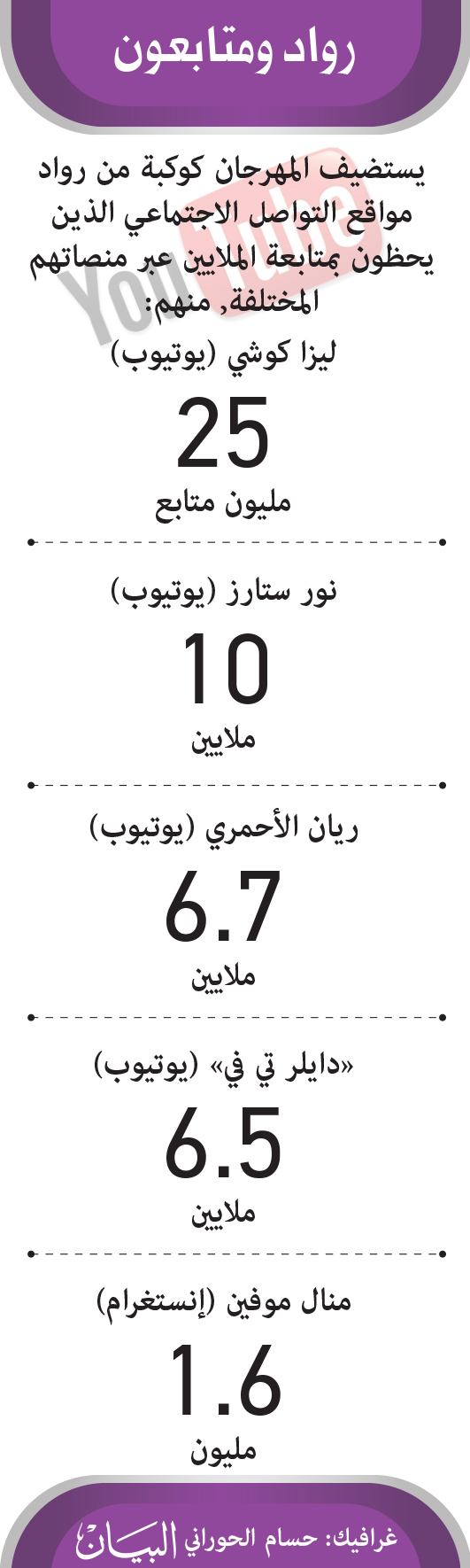 وستُلقي ليزا كوشي، التي نجحت في الدخول إلى عالم التلفزيون والأفلام السينمائية خلال الأعوام الخمسة الماضية، كلمة رئيسة حول المحتوى الرقمي، تروي من خلالها قصة نجاحها في استقطاب ملايين المشتركين على قناتها الخاصة بمنصة «يوتيوب»، عند الساعة 5.15 مساءً.