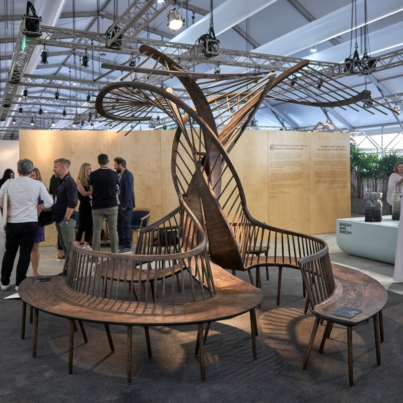 2 منتجات من مجلس «إرثي» للحرف المعاصرة، عبارة عن طاولات ومجموعة من الكراسي في إطار مبادرة «السفيفة ومختبر تصميم قوالب من الرمل». كل قطعة ضمن مجموعة الحجر مصنوعة باليد، باستخدام مزيج من الماء والرمال والخرسانة والطين والتربة، ومنجدة بجلد الإبل بلونه البيج. ويوجد في المعرض كرسي «سفيفة» للفنانة الإماراتية غاية بن مسمسار، التي تعاونت مع استوديو مرميلادا، الذي يتخذ مقره في برشلونة، لمزج تقنيات نسج النخيل قديماً وحديثاً، وبإلهام من صور منازل العريش في صحراء الإمارات، المصنوعة من سعف النخيل، رأى المصممون إمكانية تحويل الشكل المخروطى للعريش وهو يتطاير في مهب الريح، إلى مقعد يتسم بالخصوصية والحماية.