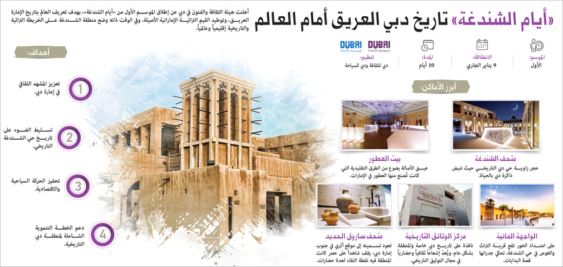 أيام الشندغة.. تاريخ دبي العريق أمام العالم أعلنت هيئة الثقافة والفنون في دبي عن إطلاق الموسم الأول من «أيام الشندغة»، بهدف تعريف العالم بتاريخ الإمارة العريق، وتوطيد القيم التراثية الإماراتية الأصيلة. وفي الوقت ذاته وضع منطقة الشندغة على الخريطة التراثية والتاريخية إقليمياً وعالمياً.