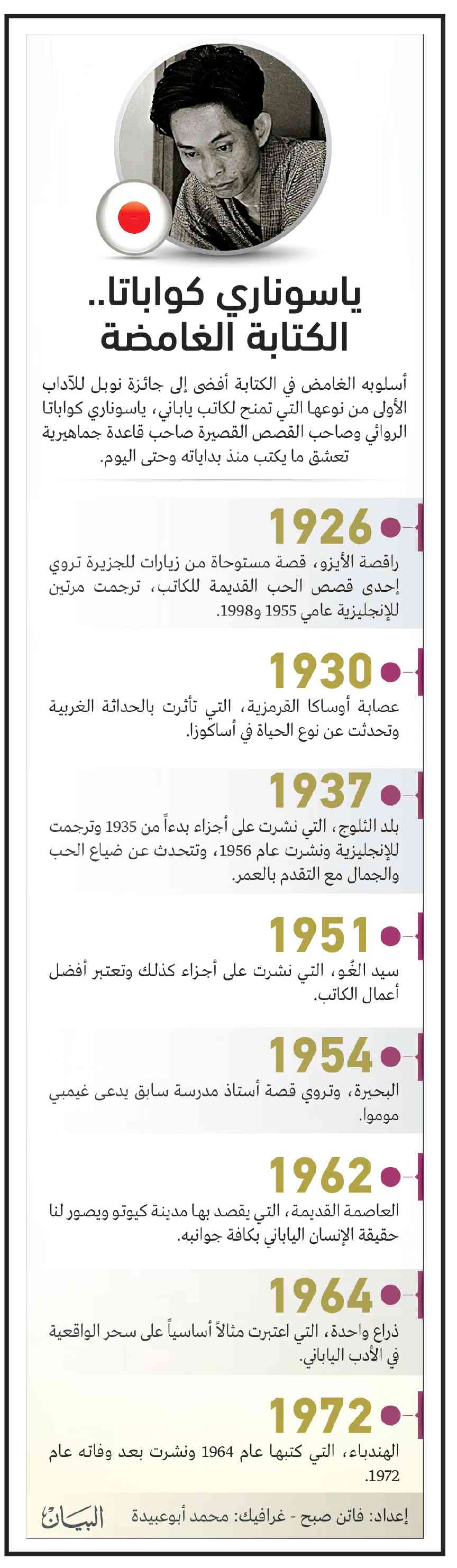 ياسوناري كواباتا.. الكتابة الغامضة إعداد: فاتن صبح -غرافيك : محمد أبو عبيدةأسلوبه الغامض في الكتابة أفضى إلى جائزة نوبل للآداب الأولى من نوعها التي تمنح لكاتب ياباني، ياسوناري كواباتا الروائي وصاحب القصص القصيرة صاحب قاعدة جماهيرية تعشق ما يكتب منذ بداياته وحتى اليوم.