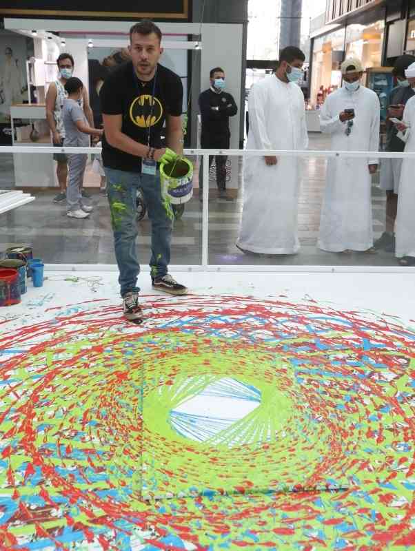 وفي هذا السياق، برزت لوحات البندول، بينما تتوسط منصة الرسم في موقع مميز مما ساهم في حشد جمهور غفير حول العرض، الذي ينفذه الفنان الصربي ميلان والمتخصص في فنون الشارع والرسم، الجرافيتي.