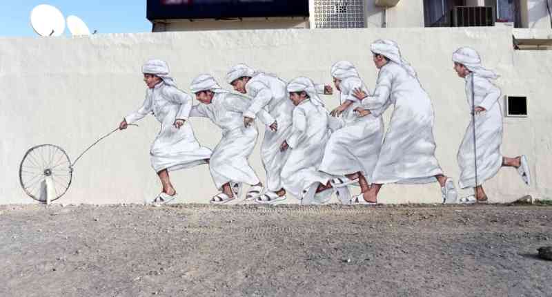 «بحار عجوز، حفر الزمان خطوطه على ملامحه، يشد بيديه مجاديف قاربه الصغير»، ليبحر فيه بعمق الثقافة الشعبية، التي ترعرعت على شواطئ دبي، بينما تطل «فتاة صغيرة على العالمين من شباكها الصغير»، وقد جدلت ضفائرها بعناية، لتطالع وشقيقها ثلة من الأطفال الذين يركضون في عرض الفريج، يلاحقون معاً عجلة صغيرة، أعدت لتكون لعبتهم المفضلة.