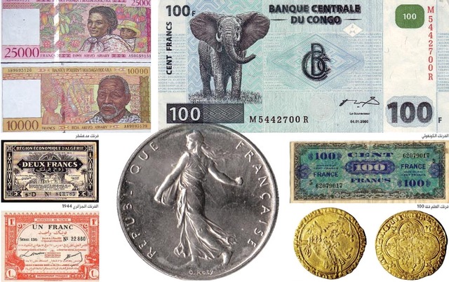 لا شك بان فرنسا تركت بصمتها في كافة المجالات على غرار العملات التي كانت الواجهة الاقتصادية لتلك المستعمرات والتي استمرت بعضها في التعامل بها إلى يومنا هذا وقد سميت بعدة تسميات باعتبار إضافتها إلى تلك البلدان، فبعد أن مر الفرنك الفرنسي بمراحل كبيرة بفضل العواصف السياسية والحربية ابتداء ب «آشوفال» ومرورا ب« آبيي» والفرنك الذهبي والثقيل وانتهاء بالفرنك الجديد قبل أن ينضم إلى اليورو فبعض البلدان تبنت هذه العملة باعتبار انها كانت خاضعة لفرنسا.