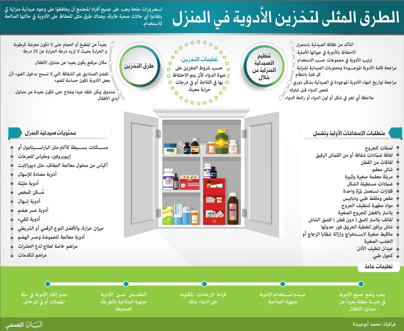 وشدد على ضرورة حفظ الصيدلية المنزلية في مكان بارد وجاف ومظلم، وبالتالي فإن الحمام أو المطبخ ليس من الأماكن المناسبة. ولذلك ينصح الدكتور علي بوضع الصيدلية المنزلية في مكان بارد دائما مع عدم تعرضها لأشعة الشمس المباشرة، وأن تكون بعيدة عن متناول يد الأطفال، ومن الأفضل أن يتم وضعها في الخزانات، التي يمكن تأمينها بقفل.