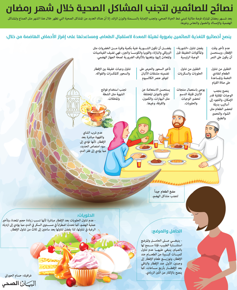 - - ينبغي على الحامل والمرضع استشارة الطبيب، فإذا سمح لها بالصيام، ينبغي عليها عدم تناول كميات كبيرة من الطعام عند الإفطار، وتوزيع طعام الإفطار إلى وجبتين، الأولى عند الإفطار والباقي بعد الإفطار بأربع ساعات، كما ينصح بالإكثار من اللبن الزبادي.
