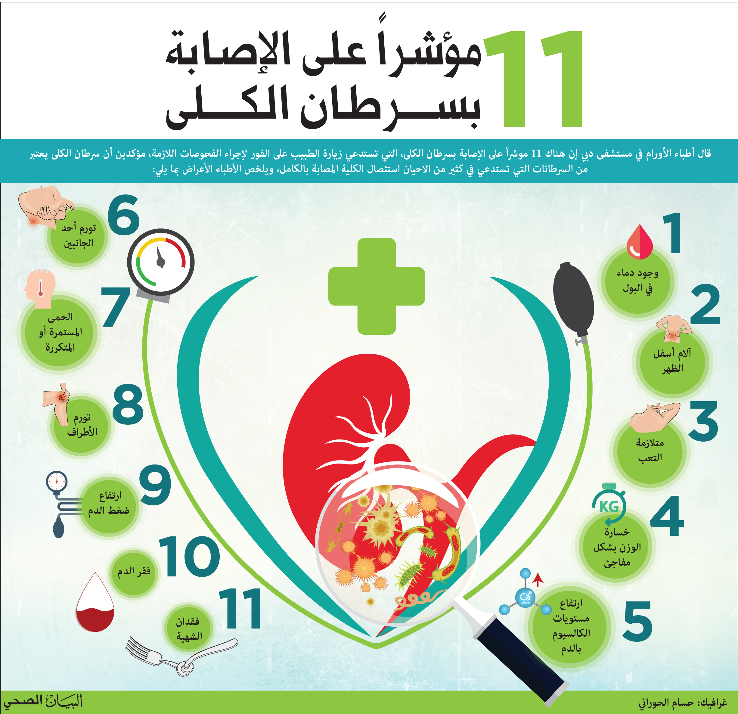Last Page11 مؤشراً على الإصابة بسرطان الكلى دبي – البيان الصحيقال أطباء الأورام في مستشفى دبي إن هناك 11 موشراً على الإصابة بسرطان الكلى، التي تستدعي زيارة الطبيب على الفور لإجراء الفحوصات اللازمة، مؤكدين أن سرطان الكلى يعتبر من السرطانات التي تستدعي في كثير من الاحيان استئصال الكلية المصابة بالكامل.