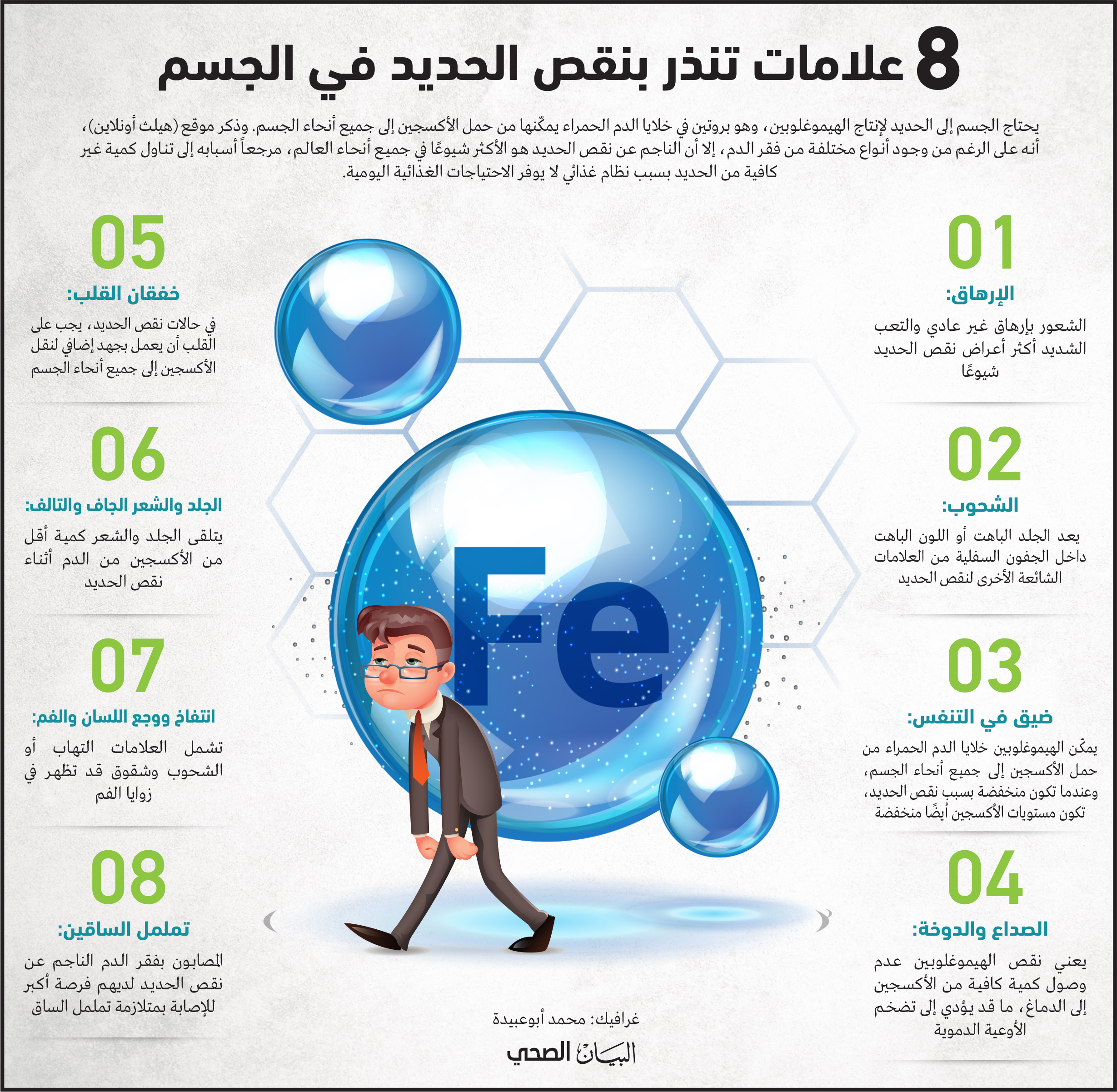 يحتاج الجسم إلى الحديد لإنتاج الهيموغلوبين، وهو بروتين في خلايا الدم الحمراء يمكّنها من حمل الأكسجين في جميع أنحاء الجسم. وذكر موقع (هيلث أونلاين)، أنه على الرغم من وجود أنواع مختلفة من فقر الدم، إلا أن الناجم عن نقص الحديد هو الأكثر شيوعًا في جميع أنحاء العالم، مرجعاً أسبابه إلى تناول كمية غير كافية من الحديد بسبب نظام غذائي لا يوفر الاحتياجات الغذائية اليومية.