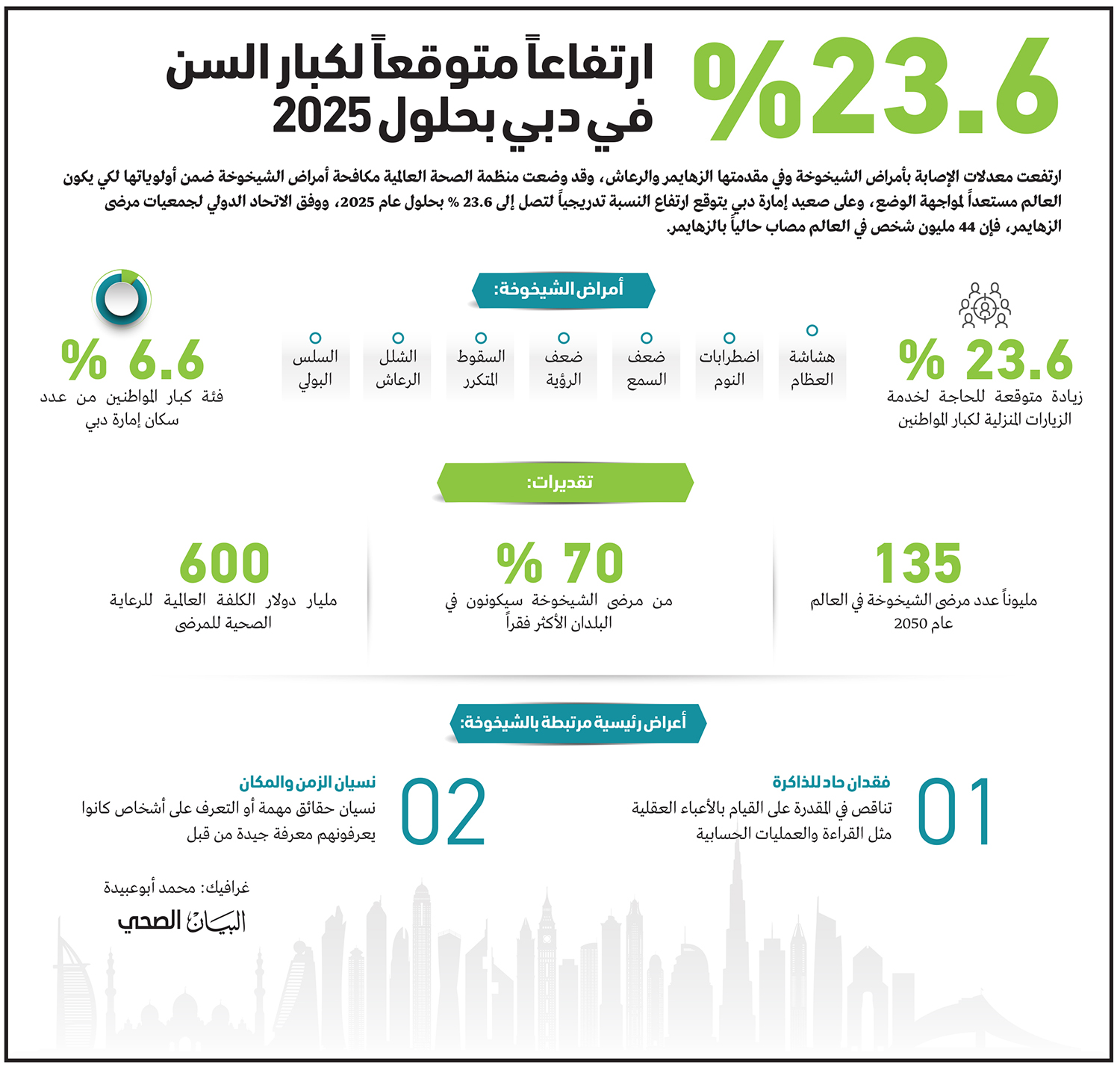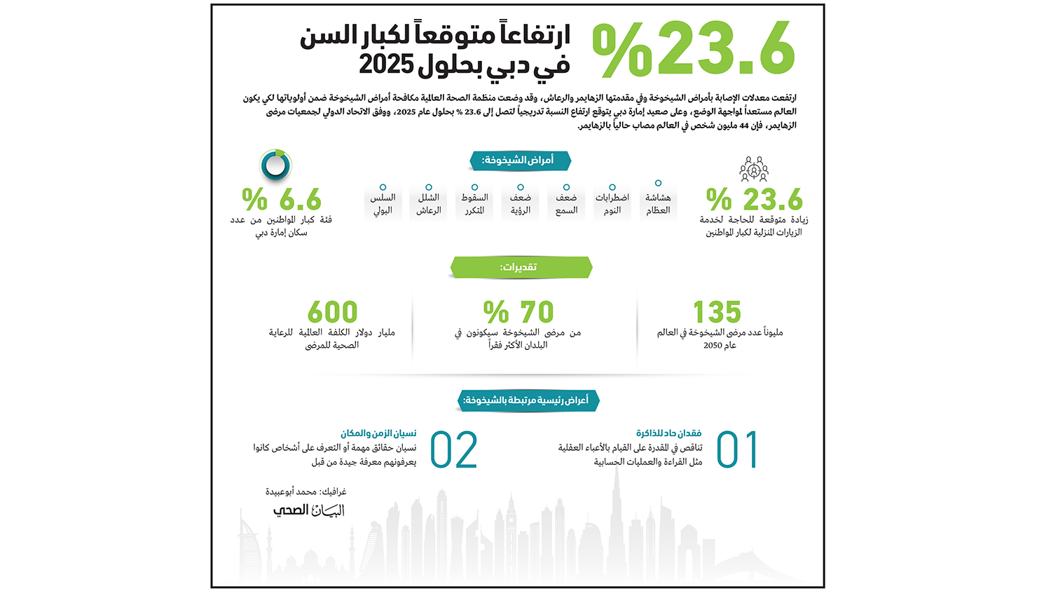 ارتفعت معدلات الإصابة بأمراض الشيخوخة وفي مقدمتها الزهايمر والرعاش، وقد وضعت منظمة الصحة العالمية مكافحة أمراض الشيخوخة ضمن أولوياتها لكي يكون العالم مستعداً لمواجهة الوضع، وعلى صعيد دولة الإمارات يتوقع ارتفاع النسبة تدريجياً لتصل إلى 23.6% بحلول عام 2025، ووفق الاتحاد الدولي لجمعيات مرضى الزهايمر، فإن 44 مليون شخص في العالم مصاب حالياً بالزهايمر.