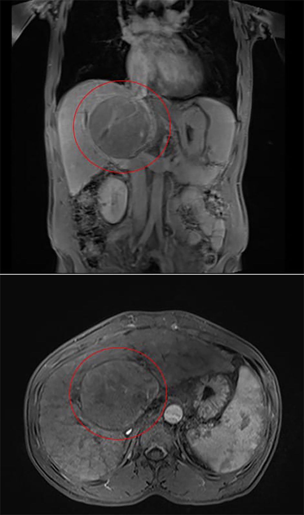 وعليه، أظهر كشف الفحوصات، بما في ذلك فحص التصوير بالرنين المغناطيسي والخزعة، عن وجود سرطان الخلايا الكبدية، وهو ورم كبدي أولي بحجم 9 سم موجود بالقرب من مركز الكبد. وكان للمريض تاريخ مرضي من التهاب الكبد المزمن B، والذي أدى على الأرجح إلى تليف الكبد مما عقَّد خيارات العلاج. عادةً ما تتطلب الحالات التي تنطوي على أورام تقع بالقرب من الأوعية الدموية الرئيسية تدابير جراحية مثل استئصال الكبد. ومع ذلك، في هذه الحالة، فإن حجم الورم وحالة تليف الكبد المتقدمة للمريض (المستوى ب) جعلت هذه الخيارات أكثر خطورة.