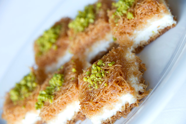 200 غ عجينة الكنافة الخشنة، سمنة نباتية 20 غ، 200 غ قشطة طازجة، 10 غ فستق حلبي مطحون، 500 غ سكر، 400 غ ماء، 10 غ عصير ليمون حامض، 10 غ ماء الزهر، 10 غ ماء الورد.
