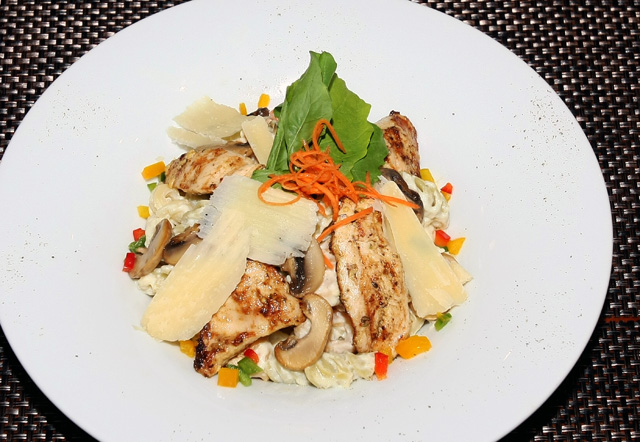 ضعي المعكرونة بعد غليها لمدة 15 دقيقة في صحن وبعد التأكد من خلوها من الماء اسكبي عليها وجبة الدجاج والفطر.