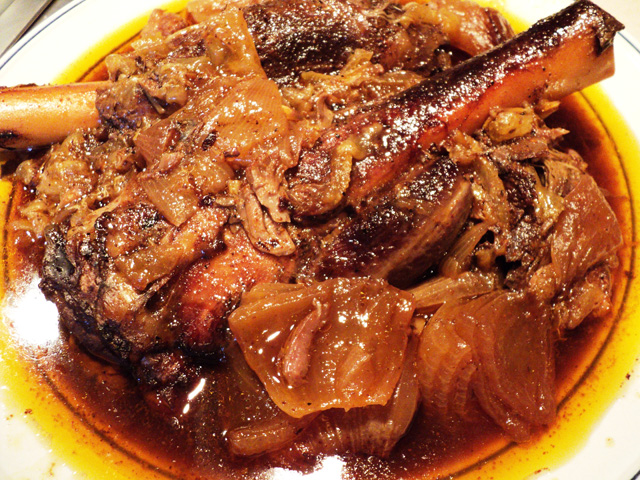 1 كغ شرائح موزات لحم البقر الهبر مع عظامه أو شرائح الفيليه، بصلتان متوسطتان مفرومتان، ملعقتا طعام من السمن النباتي أو الحيواني، ملعقة طعام من الدقيق الطحين، مكعبان من مرقة الدجاج، 1 كغ من الطماطم الحمراء المقشرة والمقطعة إلى مكعبات صغيرة، ملعقة طعام من معجون الطماطم، ملح وفلفل أبيض، قشرة ليمونة واحدة وجزرتان مقطعتان إلى مكعبات وورقة غار وعود كرفس.