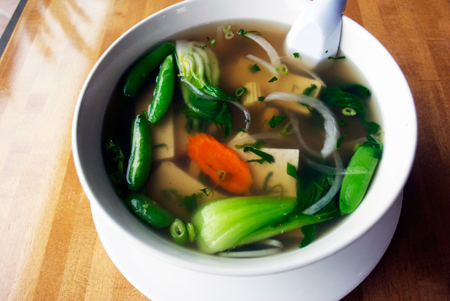 قطِّعي الكرَّاث إلى دوائر صغيرة. قطّعي لحم الصدر بالسكين إلى شرائح رقيقة (2 سم)، اطهي المعكرونة المجففة الرقيقة وضعيها فوق ماء مغلي وصبِّي عليها ماء بارداً عند وصولها مرحلة الغليان. كرري ذلك 6 مرات قبل أن تقومي بتصفيتها. جهّزي طبقاً عميقاً وضعي حوله وعلى جوانبه رقائق من المركونة المجففة بعد تكسيرها واضغطيها بأصابعك. ضعي حولها وفوقها شرائح ودوائر لحم صدر البقر الصغيرة. صبي الحساء عليها وانثري قطع الكراث.