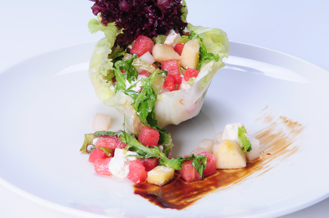 50 غ تفاح، 30 غ شمام، 30 غ بطيخ، 40 غ جبنة فيتا، 3 غ خس آيس بيرغ، 30 غ خس رومين، 30 غ خس لولو روسو، 30 غ خس فريسي، 80 غ برتقال فيناجريتي، نصف لتر عصير البرتقال، 10 مل خل، 20 غ الثوم، 100 غ بقدونس، 150 مل زيت الزيتون.