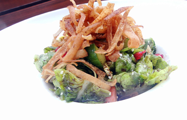 خس متوسطة الحجم، نصف كلغ طماطم قطع صغيرة، باقة زعتر أخضر بري، باقة بقدونس مفروم، باقة فجل مقطع، فلفل أخضر حلو مقطع، 4 عيدان بصل أخضر مقطع ناعماً، 3 فصوص ثوم مدقوقة، عصير ليمون، 3 ملاعق طعام خل، دبس الرمان 3 ملاعق، كوب زيت زيتون، ملح، رشة سماق، رغيف خبز عربي محمص.