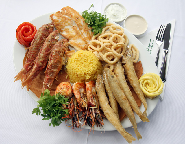 بعد غسل سمك السلطان إبراهيم جيداً نضع الليدي فنغر والكالاماري بالطحين. ثم نضع الملح والبهار ونقلي الجميع في الزيت الحار جداً. يتبل الجمبري  والهامور بالملح والبهار والحامض ويشوى.