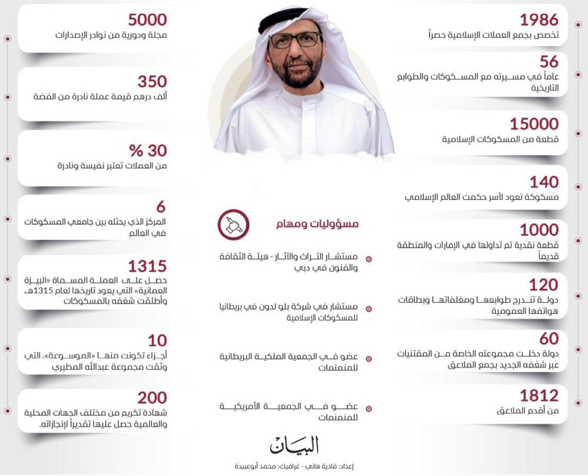 يعد عبدالله بن جاسم المطيري من أبرز المهتمين بالتاريخ ومجالاته الحيوية، وعلى رأسها المسكوكات الإسلامية، التي كرّس جانباً كبيراً من وقته وجهده لاقتناء أندرها. ولا يقتصر شغفه على العملات التاريخية فحسب، بل يمتد ليشمل الطوابع البريدية، ونوادر الكتب والمطبوعات، والمجلات، في رحلة توثيقية يسعى من خلالها إلى حفظ الذاكرة الثقافية، في هذا العرض البياني، محطات أساسية في مسيرة وسيرة عبد الله المطيري، وأبرز المقتنيات في مجموعته الغنية والمميزة.