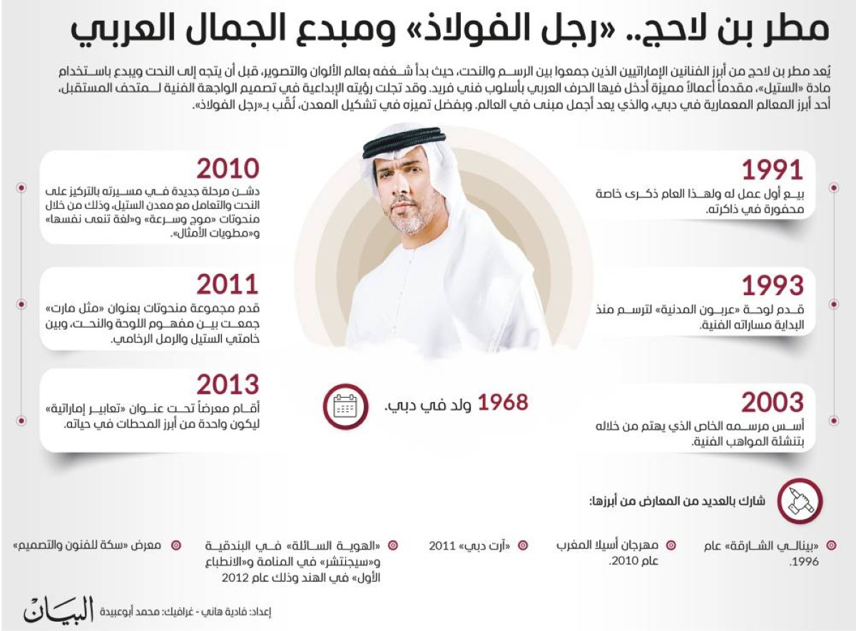 يُعد مطر بن لاحج من أبرز الفنانين الإماراتيين الذين جمعوا بين الرسم والنحت، حيث بدأ شغفه بعالم الألوان والتصوير، قبل أن يتجه إلى النحت ويبدع باستخدام مادة «الستيل»، مقدماً أعمالاً مميزة أدخل فيها الحرف العربي بأسلوب فني فريد. وقد تجلت رؤيته الإبداعية في تصميم الواجهة الفنية لمتحف المستقبل، أحد أبرز المعالم المعمارية في دبي، والذي يعد أجمل مبنى في العالم. وبفضل تميزه في تشكيل المعدن، لُقّب ب «رجل الفولاذ» .