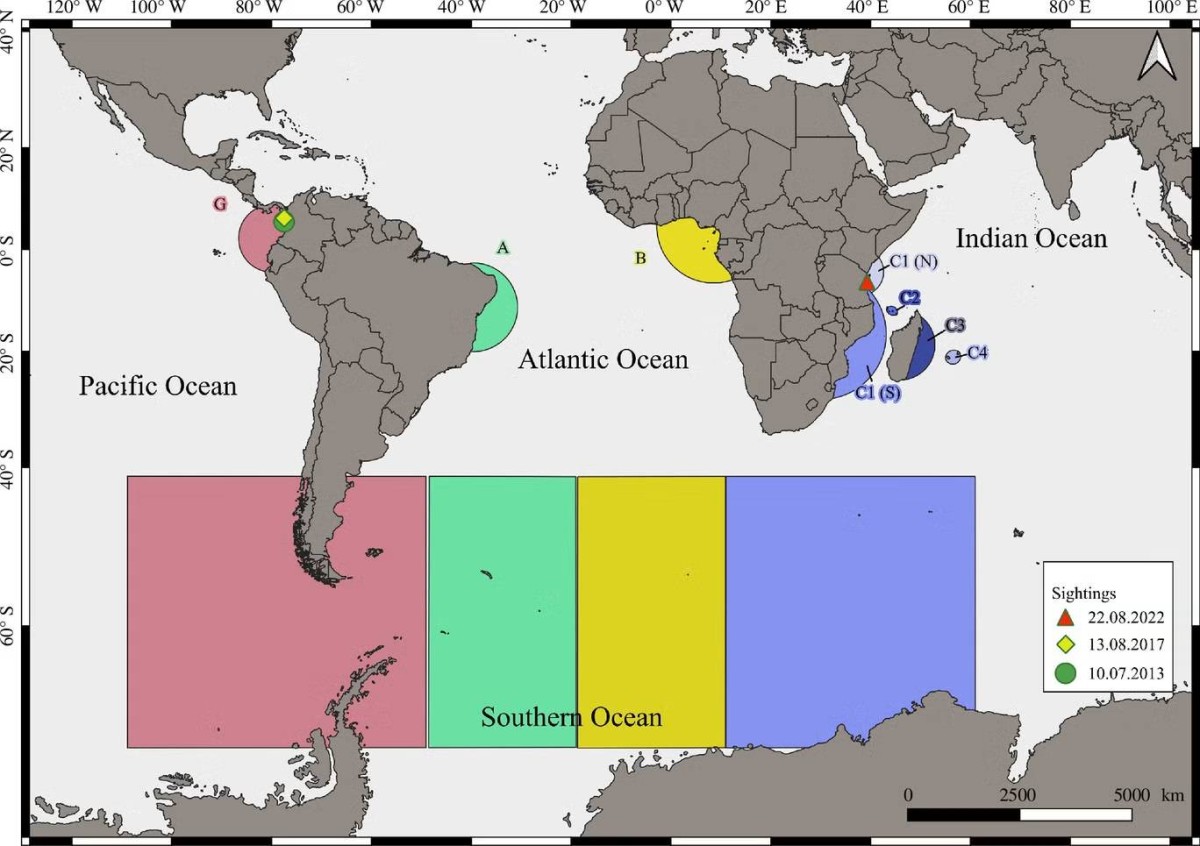 وسجلت دراسة سابقة سفر ستة حيتان عبر مناطق التكاثر في ضفة أبرولهوس بالقرب من البرازيل وكيب تاون في جنوب إفريقيا بين عامي 2002 و2021.