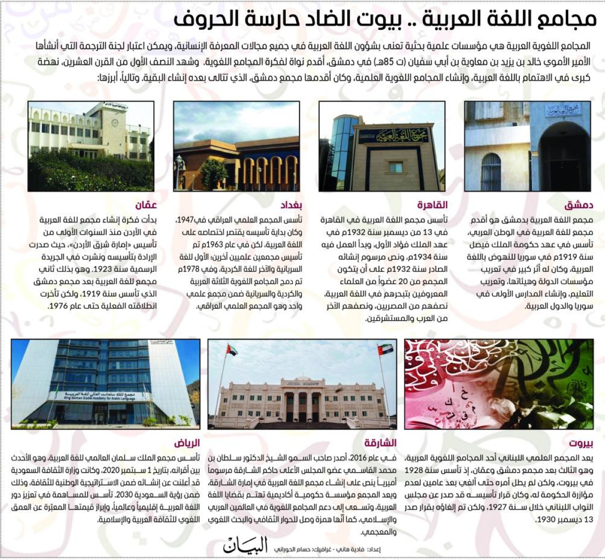 وشهد النصف الأول من القرن العشرين، نهضة كبرى في الاهتمام باللغة العربية، وإنشاء المجامع اللغوية العلمية، وكان أقدمها مجمع دمشق، الذي تتالى بعده إنشاء البقية. وتالياً، أبرزها: